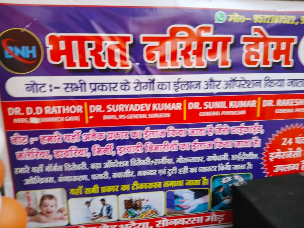 गया जिले के बाराचट्टी प्रखंड के सोनबरसा (भदेया बिन्दा रोड) स्थित नवनिर्मित 'भारत नर्सिंग होम' का भव्य उद्घाटन शेरघाटी विधायक उदय कुमार सिंह एवं नीमा पंचायत के पूर्व मुखिया व वरिष्ठ समाजसेवी कामेश्वर पासवान ने संयुक्त रूप से फीता काटकर किया।